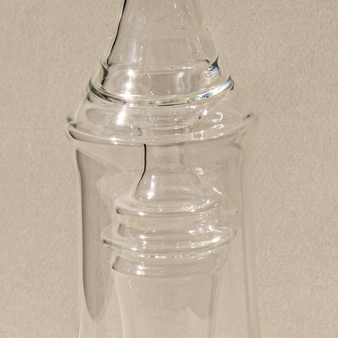 Transparent borosilicate dressing bottle with cork stopper and spiral design.