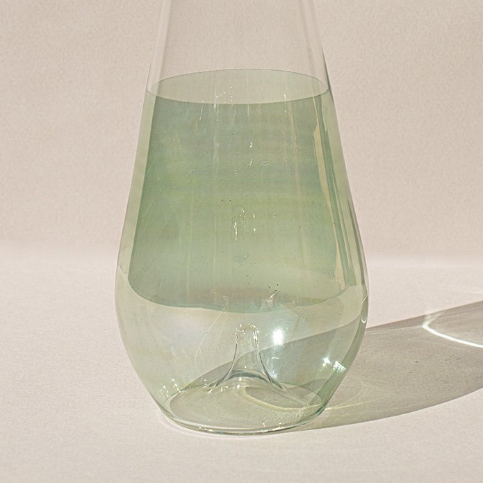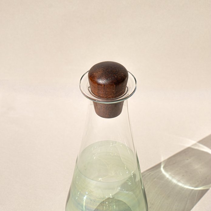Half green and half transparent borosilicate glass bottle with acacia wood lid.
