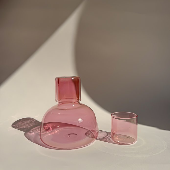 Deep red glass jug with two stackable tumblers and a navy blue rim.