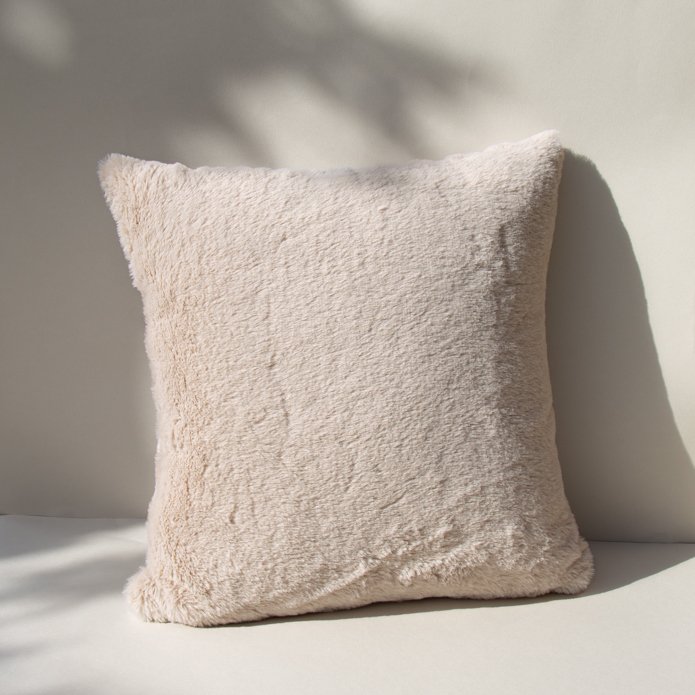Faux fur decorative cushion with filling, featuring an ultra-soft texture and available in beige and ice blue.
