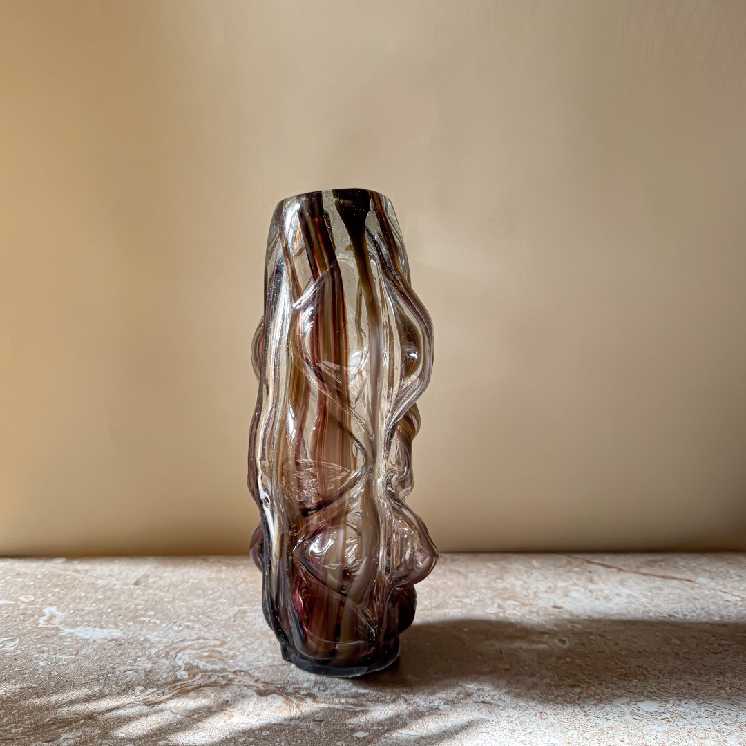 This hand-blown glass vase is crafted from clear glass and enhanced with elegant brown linear detailing that flows naturally through the form. Each piece is individually shaped through the glass-blowing process, giving it subtle variations that highlight its artisanal character. The combination of transparency and warm brown accents creates depth, making the vase suitable for both minimalist and styled interiors. Available in two different sizes, allowing for versatile styling whether used as a standalone statement piece or layered with other decorative objects.